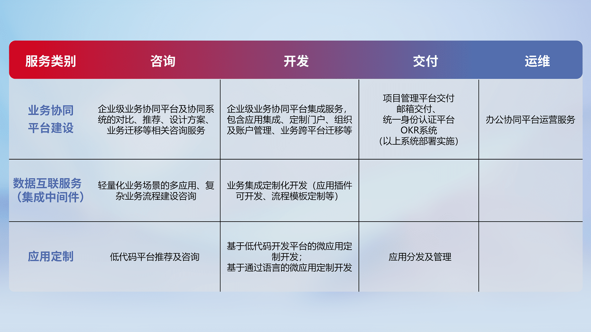 针对钉钉、、企微、、、IDaas等平台级产品提供产品的规划、、方案、、交付、、、、定制化开发等服务,,,,实现如统一协同办公、、智能客户服务、、、、混合会议管理、、、智能数据查询、、、等业务场景,,,实现数字化转型。。