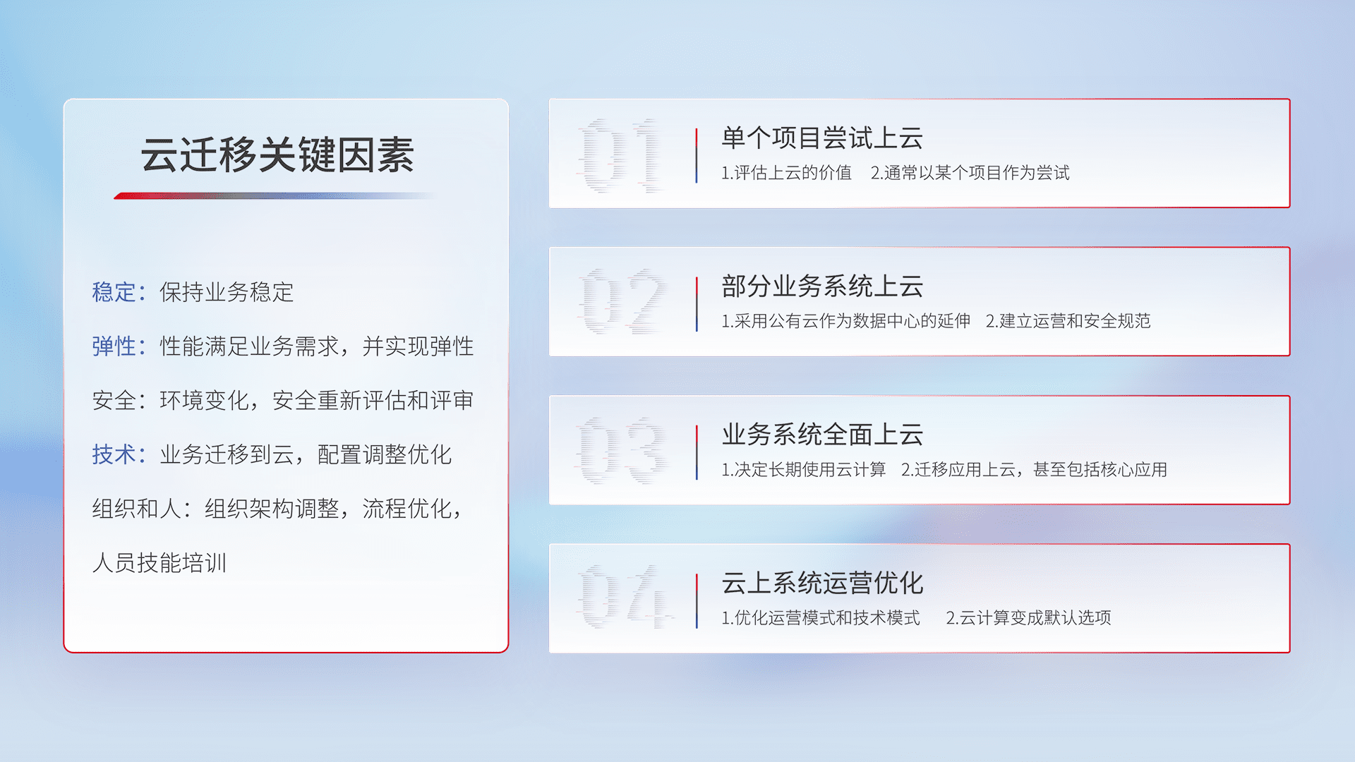 结合实际业务,,从规划设计、、云平台选型、、、、云原生改造、、、、数据迁移、、集成交付,,,迁移全过程为客户识别最佳上云路径,,,做好风险识别管理,,,,设计网络架构、、、身份权限、、、安全审计合规、、操作审计、、、日志审计、、、监控告警策略、、、多站点容灾设计等,,,对云上基础设施进行整体规划,,提升IT治理水平,,,,以满足弹性、、、高可用、、高性能的需求。。。。