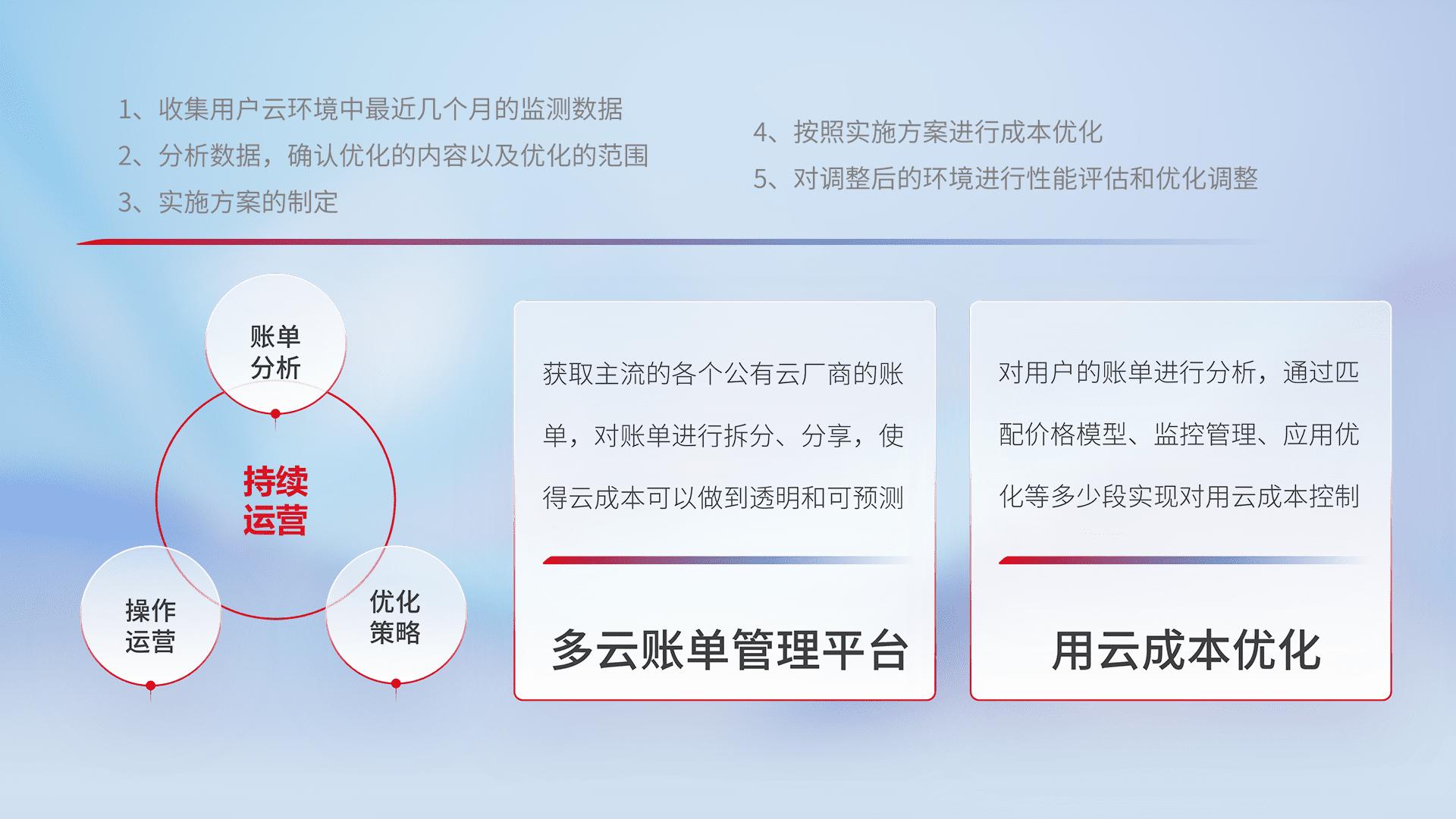 通过多云纳管,,,,以统一的资源数据模型把客户的云资源进行抽象和封装,,,,进而实现对多云资源的统一操作,,,,保障云资源管理的可靠性、、、稳定性与可用性。。。量身定制化运维内容,,,,配置、、开发运维、、、、补丁管理、、备份、、、、监控、、、认证和访问管理、、审计和日常巡检等,,,,保障在用云过程中的可靠度,,稳定度以及高可用率。。